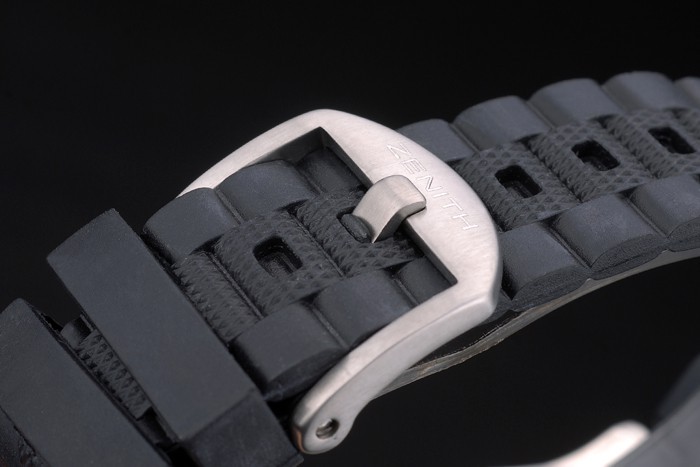 Bracelet: Textured black rubber link bracelet with hook buckle clasp and ‘Zenith’ inscription